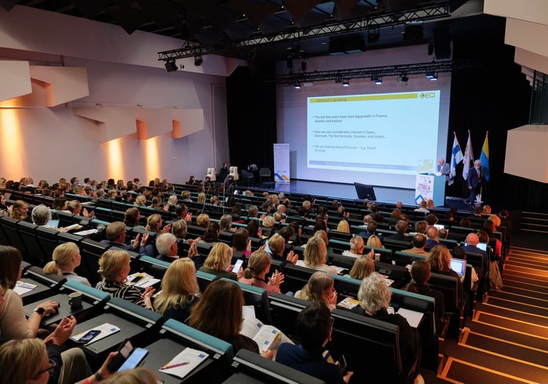 На конференції OECI 2023: акад. Василь Чехун (УТДР), Claudio Lombardo (OECI General Manager), Ольга Россильна, Thierry Philip (President of OECI)